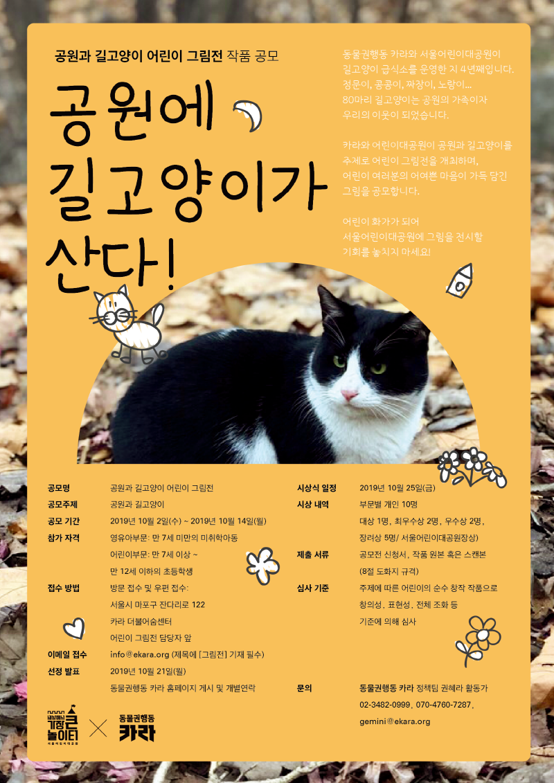 서울어린이대공원에 있는 고양이는 물론, 자기 동네의 길고양이들들 주제로 그림을 그려 2일부터 14일 사이에 공모하면 된다. 수상작은 25~27일 어린이대공원 안에 있는 '땡땡마을'에 전시된다. 공원측은 이 기간 동안 다양한 부대 행사도 진행할 예정.